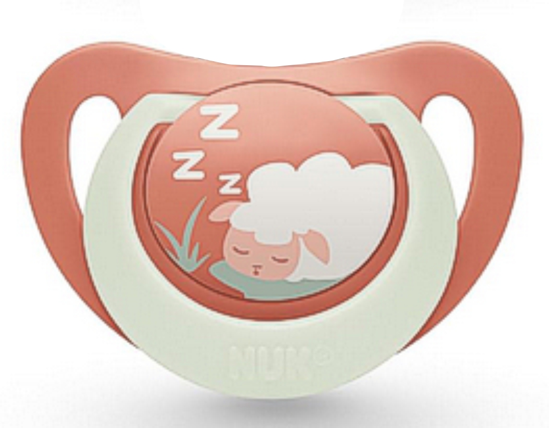 Schnuller beigerot mit weißem Ring, Motiv Schäfchen schläft, leuchtet in der Nacht SPEZIALVERSCHLUSS!