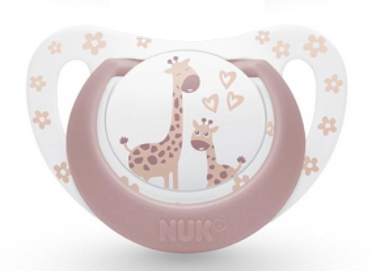 Schnuller weiß mit Ring terrakotta, Motiv Giraffenmama mit Baby SPEZIALVERSCHLUSS!