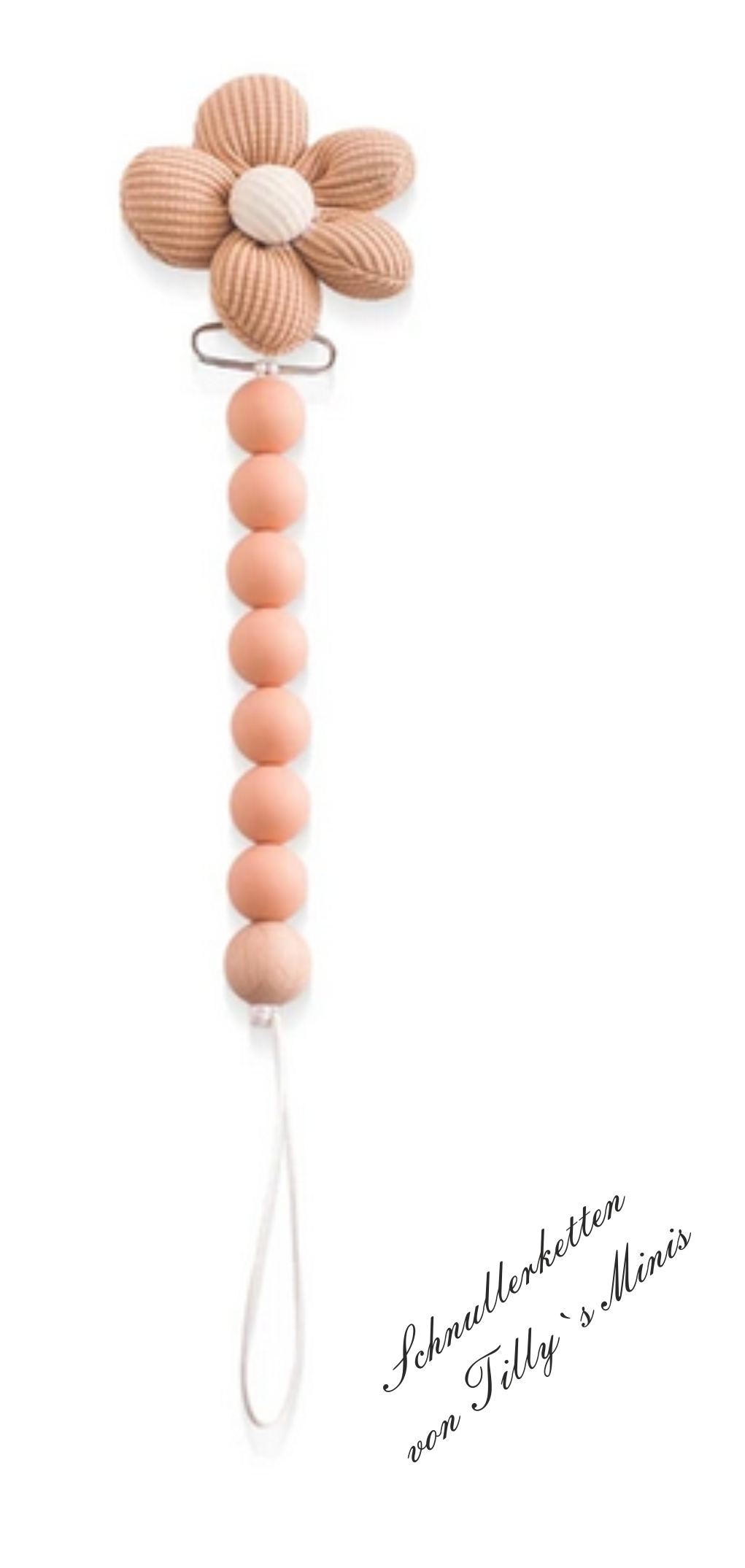 Schnullerkette Holzperlen mit Blume aus Stoff als Clip, lachs